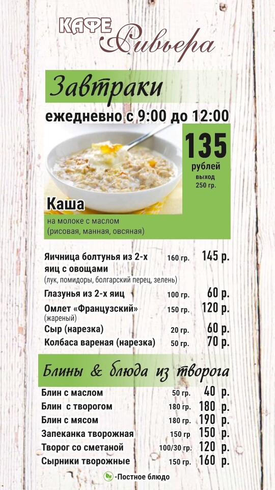 Каша рисовая, овсяная на молоке с маслом | 250гр. | 195р. |
